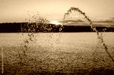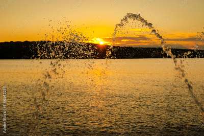beautiful streams of water from fountains on the lake, reflection of sunset light in drops, dynamics frozen