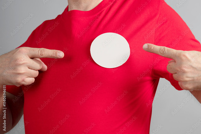 Round badge sticky label mockup template. Pin button on chest. White tags, paper round stickers, isolated rounded signs, circle adhesive symbol