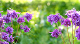 lilac Aquilegia flowers in summer garden close up. violet wild flowers of perennial garden plant Aquilegia vulgaris (columbine, granny's nightcap, granny's bonnet). inspiration floral nature image