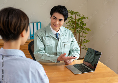 パソコンを見せて営業する作業服の男性