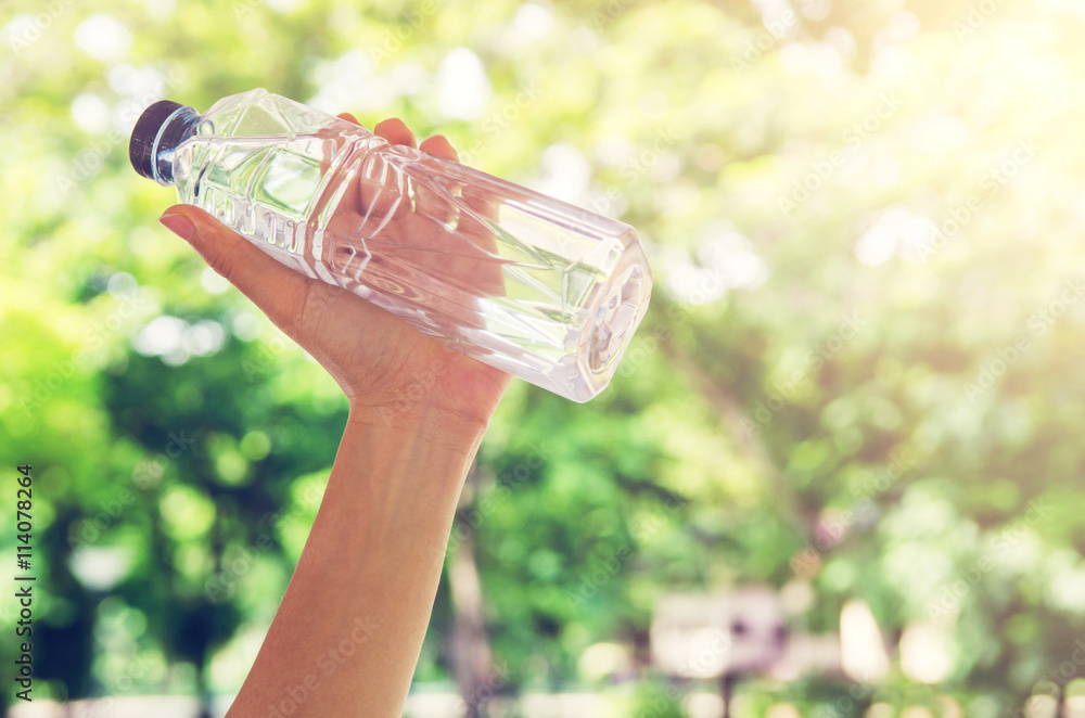 Close up female hand holding water at summer green park outdoor and bokeh nature background, healthy concept.