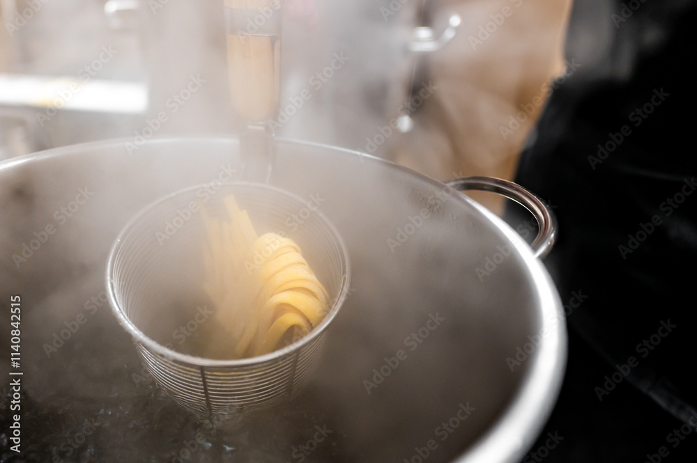 A close-up view of pasta being cooked in a steaming pot. The pasta is held in a metal strainer, with steam rising, creating a warm and inviting culinary atmosphere. Perfect for food-related themes.