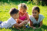 Smiling children eating chips on a nature background.children.