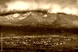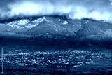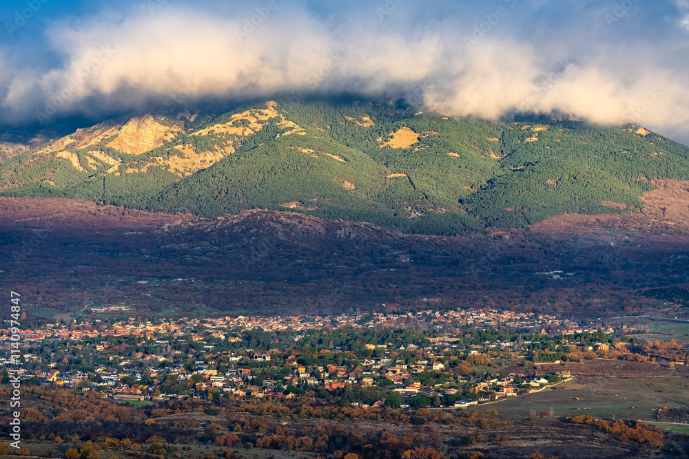 Thick clouds coming down from the mountain towards the village of Soto del Real, Madrid, Spain.