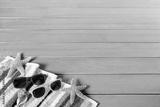 Tropical beach background corner border sunglasses starfish couple sunbathing summer vacation holiday accessories on old weathered blue wood deck decking or boardwalk photo