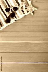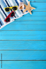 Tropical beach background border striped towel sunglasses starfish couple sunbathing summer vacation holiday accessories on old weathered blue wood deck decking or boardwalk photo
