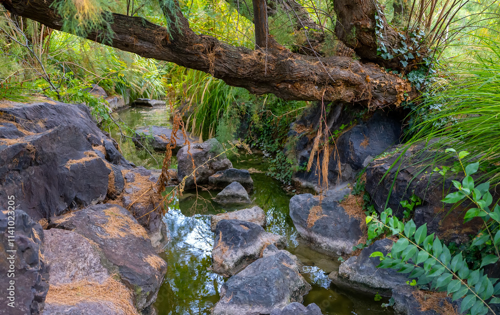 A stream flowing through a tropical forest.