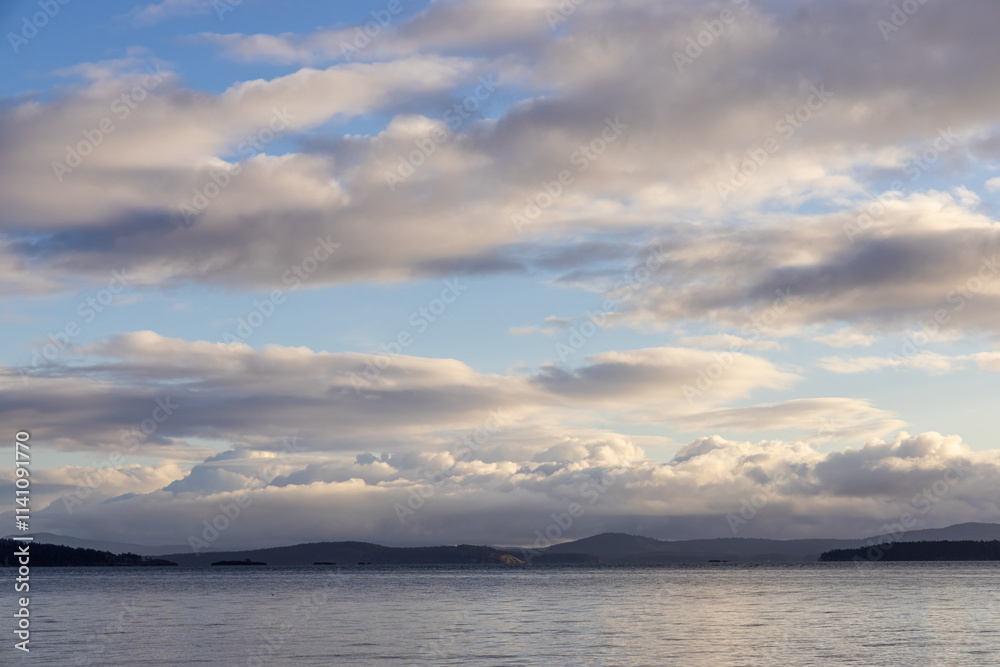 Peaceful Ocean Scene with Cloud-Draped Sky and Distant Mountains