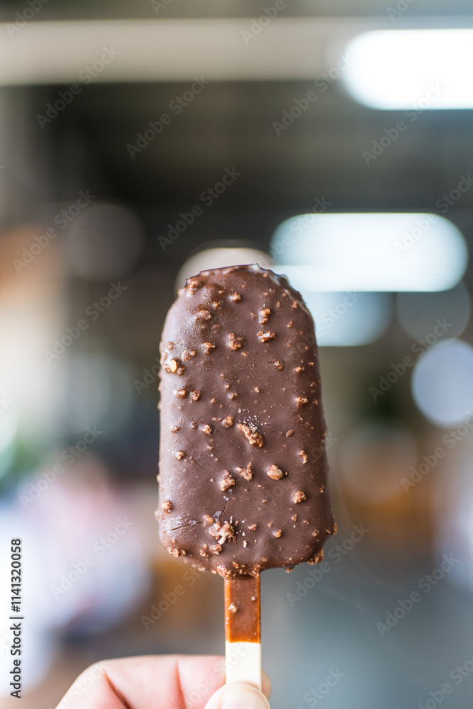 Chocolate popsicle ice cream bar with crushed peanut nuts, pastry and sweet food style concept