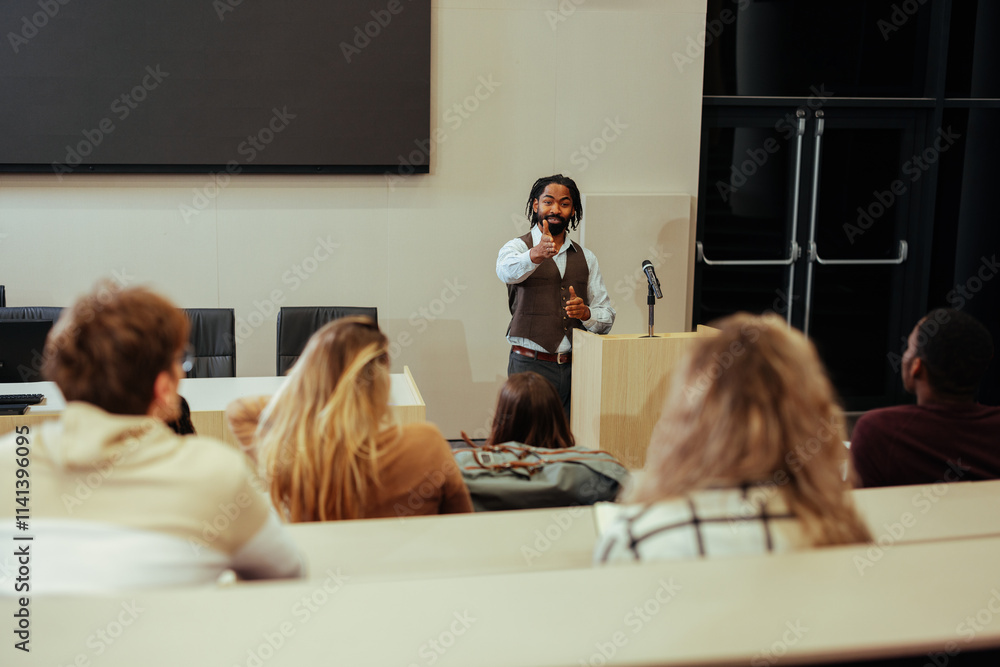 Smiling teacher gesturing thumbs up to university students in lecture hall