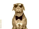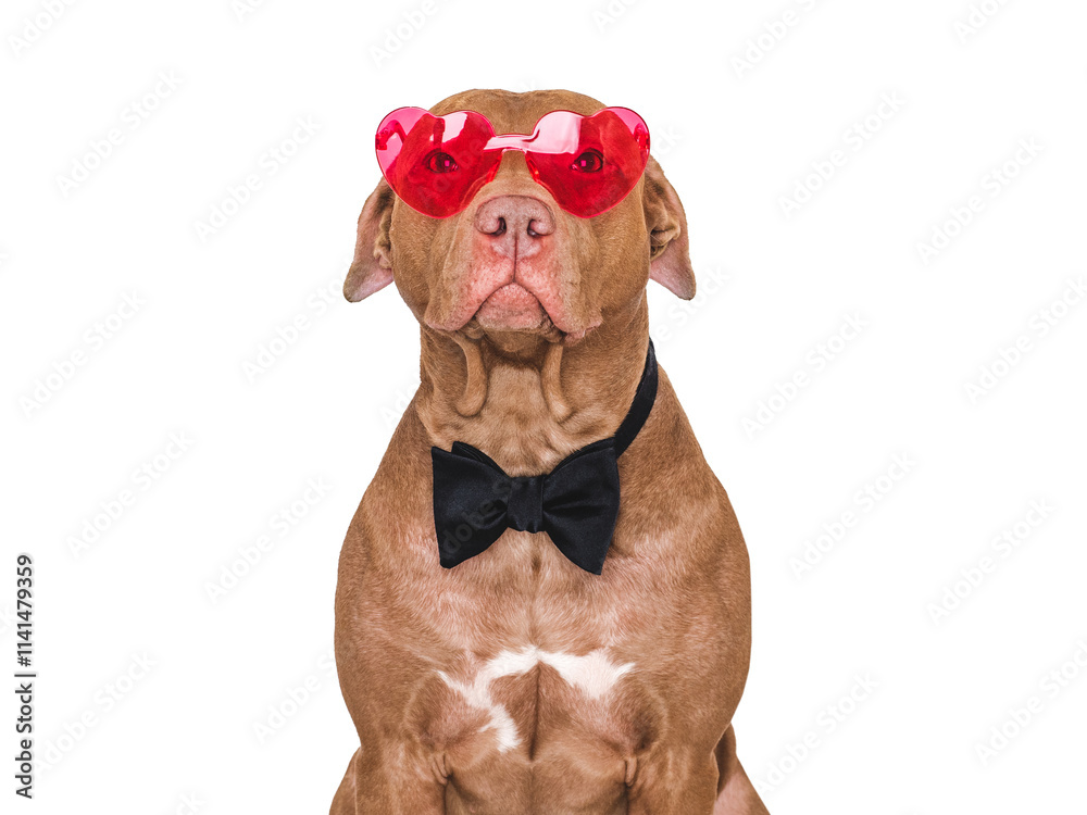 Happy Valentine's Day. Stylish, lovable dog, red sunglasses and bow tie. Close-up, indoors. Studio shot. Congratulations for family, relatives, loved ones, friends and colleagues. Pet care concept