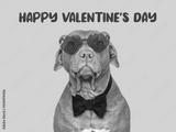 Happy Valentine's Day. Lovable dog and congratulatory inscription. Closeup, indoors. Studio shot. Congratulations for family, relatives, loved ones, friends and colleagues. Pet care concept