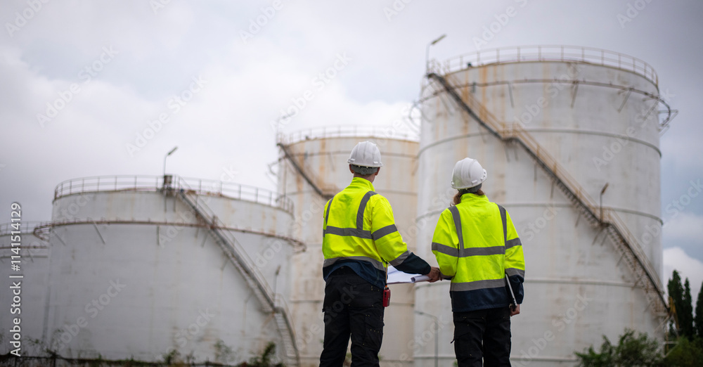 Engineers wearing safety gear, including hard hats examining survey detail standing industrial facility gas or oil refinery engaged in a job requires high safety standards concept.