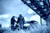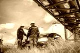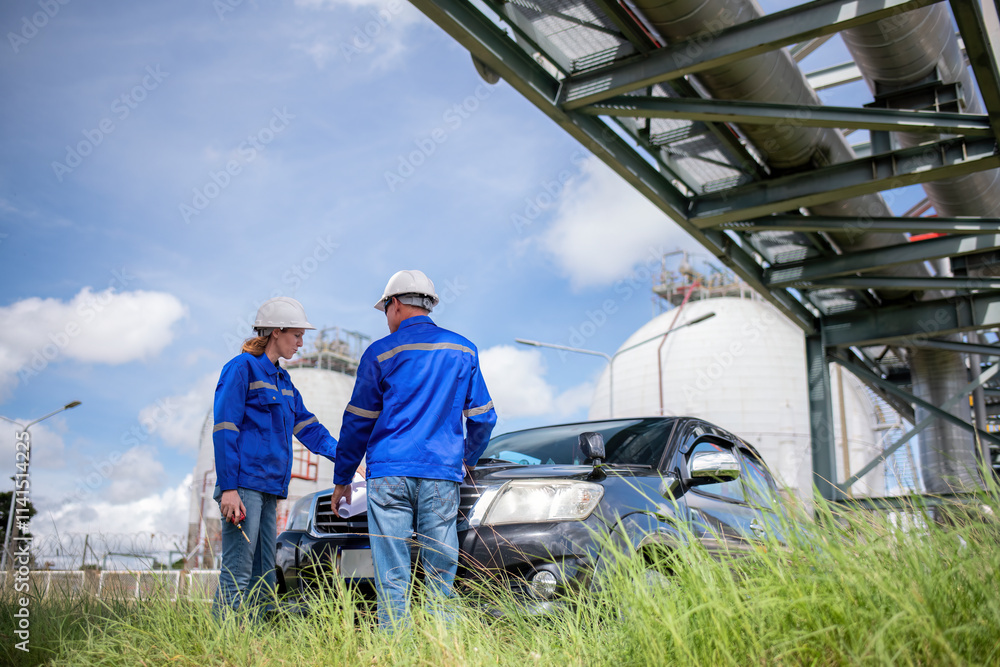 Engineers wearing safety gear, including hard hats examining survey detail standing industrial facility gas or oil refinery engaged in a job requires high safety standards concept.
