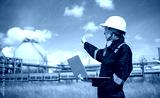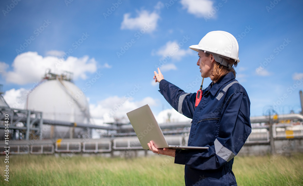 Engineers wearing safety gear, including hard hats examining survey detail standing industrial facility gas or oil refinery engaged in a job requires high safety standards concept.