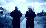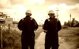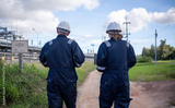 Engineers wearing safety gear, including hard hats examining survey detail standing industrial facility gas or oil refinery engaged in a job requires high safety standards concept.