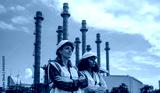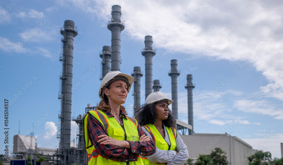 Engineers wearing safety gear, including hard hats examining survey detail standing industrial facility gas or oil refinery engaged in a job requires high safety standards concept.