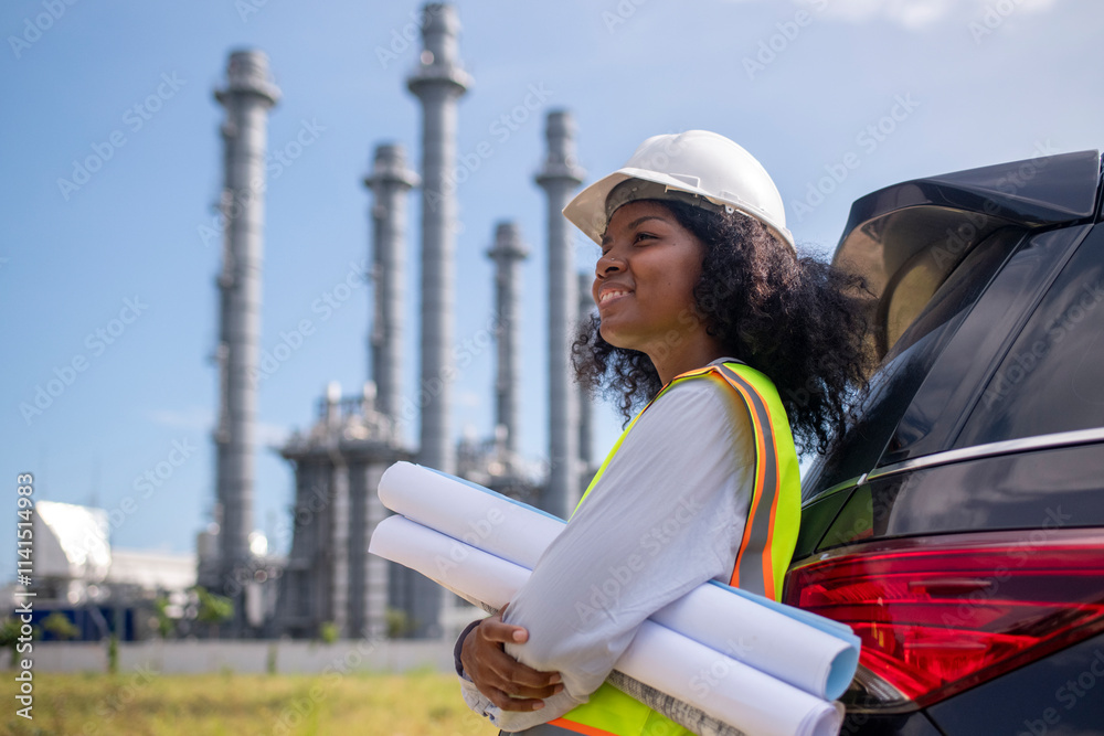 Engineers wear uniform standing near the vehicle hand holding blueprint paper show, survey inspection work plant site use tablet see detail of work with oil refinery background.