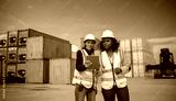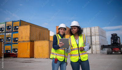 Engineer or dockworker working in the construction container dock yard checking and inspection containers data on computer program environment is container shipping Logistics business concept.
