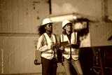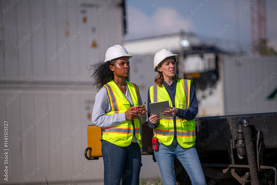 Engineer or dockworker working in the construction container dock yard checking and inspection containers data on computer program environment is container shipping Logistics business concept.