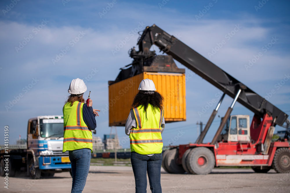 Engineer or dockworker working in the construction container dock yard checking and inspection containers data on computer program environment is container shipping Logistics business concept.