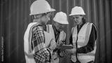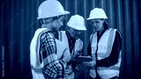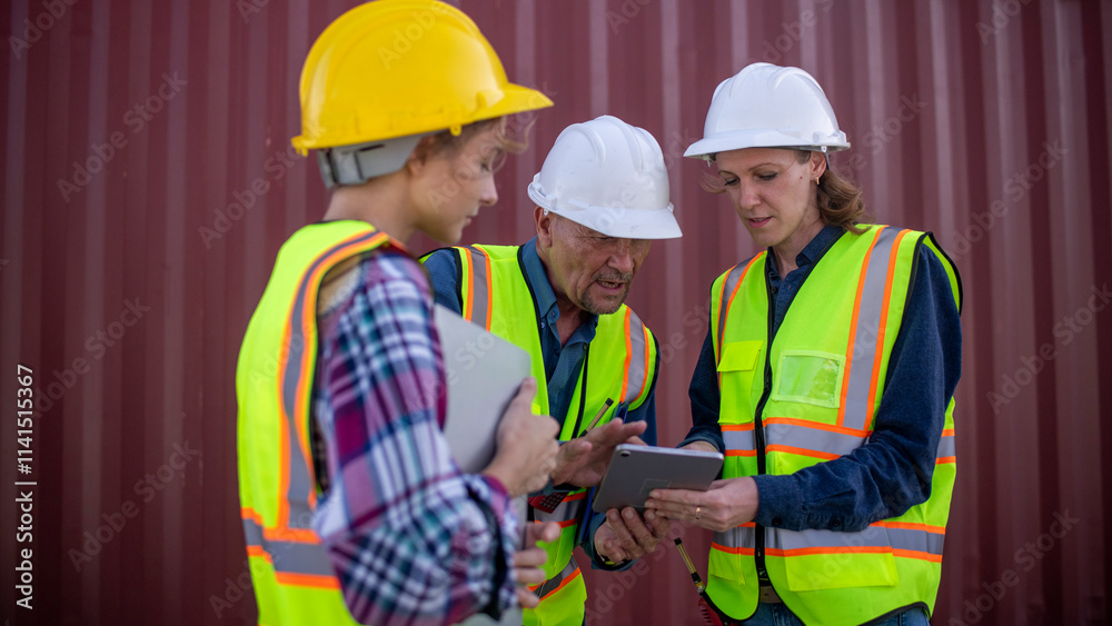 Engineer or dockworker working in the construction container dock yard checking and inspection containers data on computer program environment is container shipping Logistics business concept.