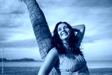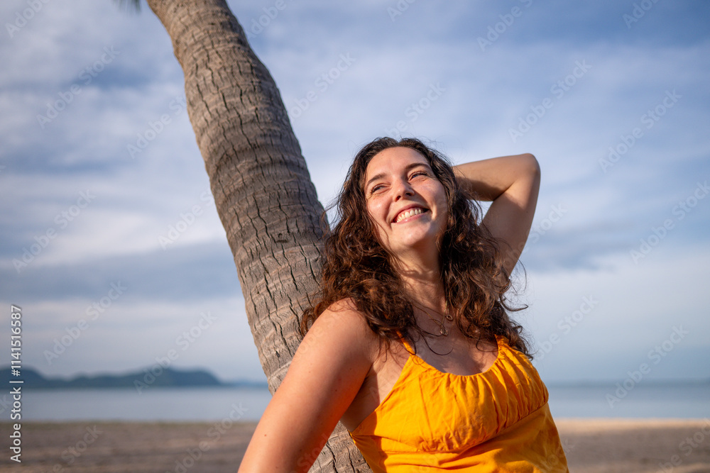 Portrait beautiful woman against a palm tree on a serene beach relaxed and confident, enjoying the peacefulness of the environment leisure and the beauty of nature concept.