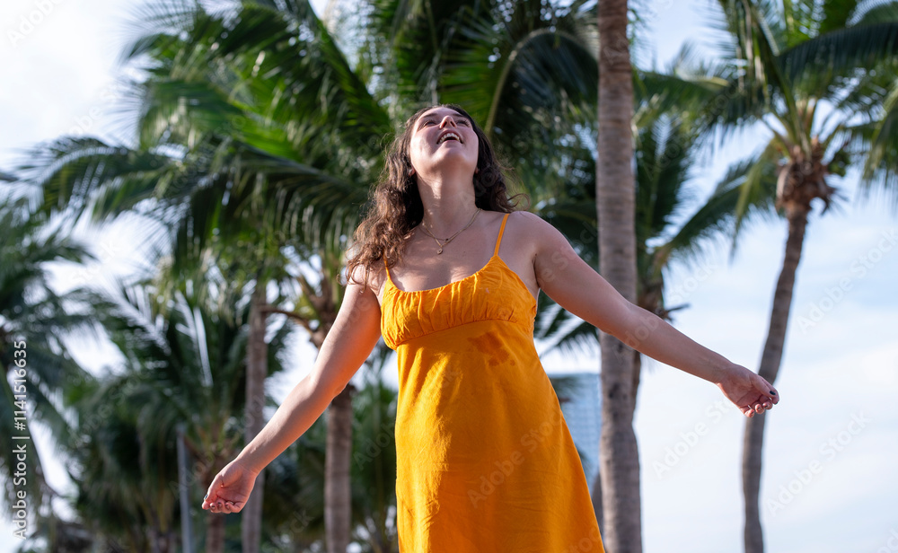 Portrait beautiful woman against a palm tree on a serene beach relaxed and confident, enjoying the peacefulness of the environment leisure and the beauty of nature concept.