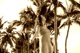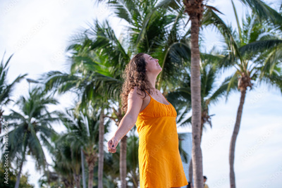 Portrait beautiful woman against a palm tree on a serene beach relaxed and confident, enjoying the peacefulness of the environment leisure and the beauty of nature concept.