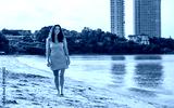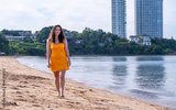 Portrait cheerful woman smiling brightly at the camera convey feelings of happiness of beach relaxation, summer holiday.
