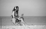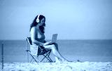 Woman seated on a portable chair on a sandy beach, working on a laptop appears focused and relaxed, embodying the concept of remote work or digital nomadism in a picturesque setting.