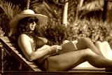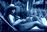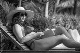Portrait sexy woman wearing bikini wearing bikini wide-brimmed straw hat and stylish sunglasses reading book relaxation and attentiveness, vacation or holidays at swimming pool.