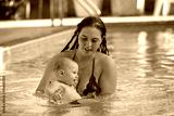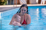 Mother and a baby are enjoying their time in a swimming pool overall mood is playful, warm and serene, capturing a beautiful family moment by the pool.
