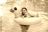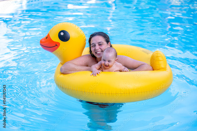 Mother and a baby are enjoying their time in a swimming pool overall mood is playful, warm and serene, capturing a beautiful family moment by the pool.