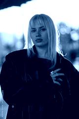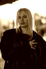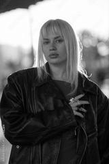 Ukrainian model posing in leather jacket during fashion photoshoot