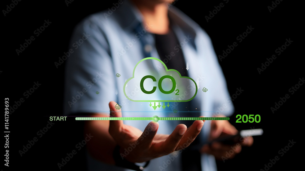 Businessman showing rising arrow Along with carbon reduction to reduce carbon dioxide and carbon credits to limit global warming from climate change, the concept of green economy, bio-circle.