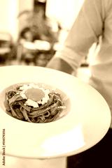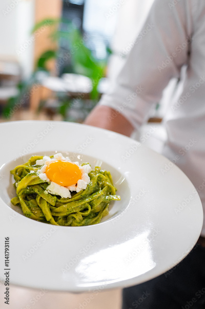 A close-up of a chef presenting a plate of green pasta with a vibrant egg yolk and crumbled cheese on top. The dish is elegantly presented, surrounded by a blurred restaurant background.