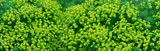 Spring flower background. flowering cypress spurge yellow-green flowers in spring garden. Euphorbia cyparissias, perennial ornamental Herbaceous plant for garden landscaping. top view. long banner