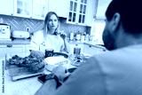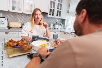 A woman eats a piece of chicken while sitting at a kitchen table with a man