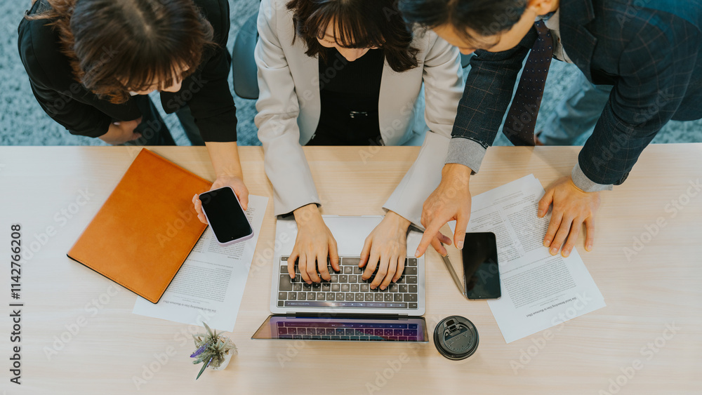ノートパソコンを使ってミーティングをする3人の男女ビジネスマン