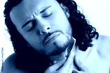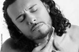 Man with curly hair grooming his beard carefully using a straight razor against a plain white background