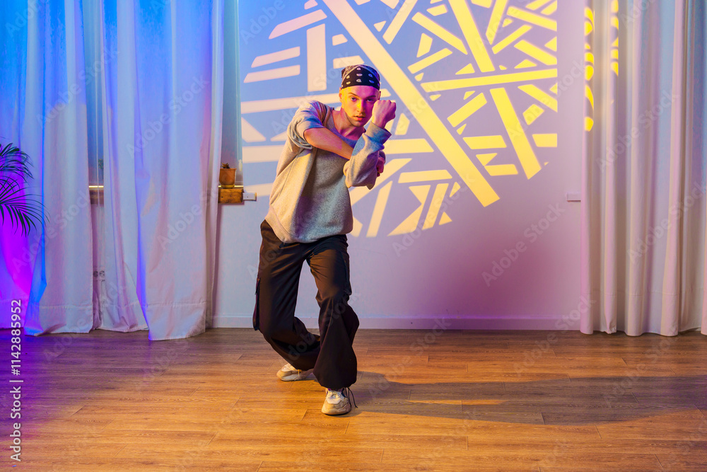A young man dances in a studio with colorful lighting, showcasing his smooth moves