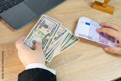 Close-up of female bank employee's hands counting euro, dollar bills, paper money, Forex Analysis, Currency Evaluation, International Exchange Rates