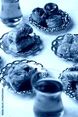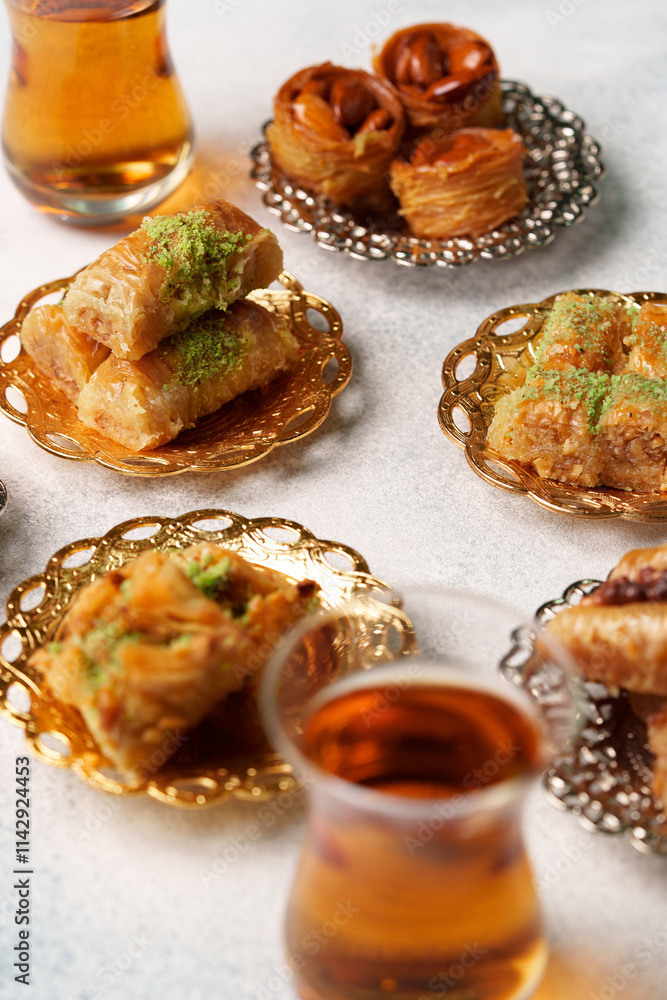 Traditional Middle Eastern sweets served with tea in an elegant setting during a festive gathering