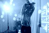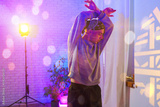 A young man dances in a studio, bathed in colorful lights