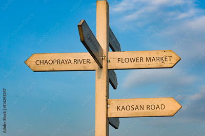 Bangkok street sign with directions to Chaopraya river, Kaosan road, flower market and Chinatown with blue sky on the background. Travel directory pointer with copy space