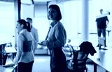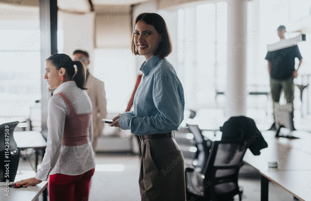 A smiling businesswoman holding a phone in a modern office setting, surrounded by a multicultural team, highlighting teamwork, cooperation, and professional communication in the workplace.