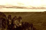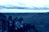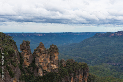 Three Sisters rock formation viewed from Echo Point lookout. Iconic Australian tourist attraction in Blue Mountains National Park, NSW, Australia