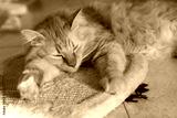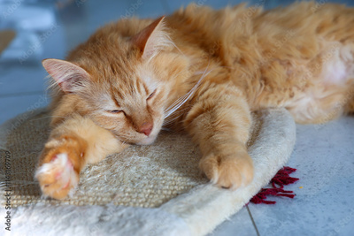 Cute fluffy ginger cat sleeping on a scratching post in the room.