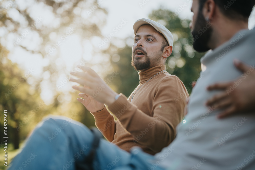 Two friends engage in a deep, meaningful conversation while sitting outdoors in a sunlit park. The scene captures a moment of connection and tranquility amidst a natural, serene backdrop.